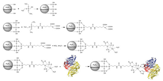 Magnetic nanoparticles (MNPs) are increasingly important in several areas of application, including cell labeling and separation [17], drug delivery [18], separation of peptides and proteins [19], detection of nucleic acid [20], and development of antibacterial agents [21,22]. With the support of evidence-based research, this nanomaterial has also become very attractive for the preparation of immobilized enzymes [23]. However, appropriate surface modification of MNPs is always an important part for today’s developers just because it is not so easy to directly immobilize enzymes onto the surface of pristine nanomaterials. MNPs with specific features can be prepared by attachment of an affinity ligand on the surface of prefabricated magnetic supports [13,14,24,25,26], which allow quick, efficient separation of the immobilized enzymes from the reaction medium by applying a magnetic field. High surface-to-volume ratio, nontoxicity and biocompatibility, and good dispersibility are surely other comparative advantages to the immobilization of enzymes onto the prefabricated MNPs [27].