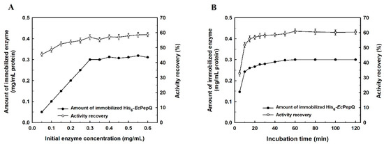 Effects of initial enzyme concentration (A) and coupling time (B) on the immobilization efficiency of His6-EcPepQ. In these experiments, enzyme samples were incubated with 0.2 mg/mL of NiNTASiMNPs.