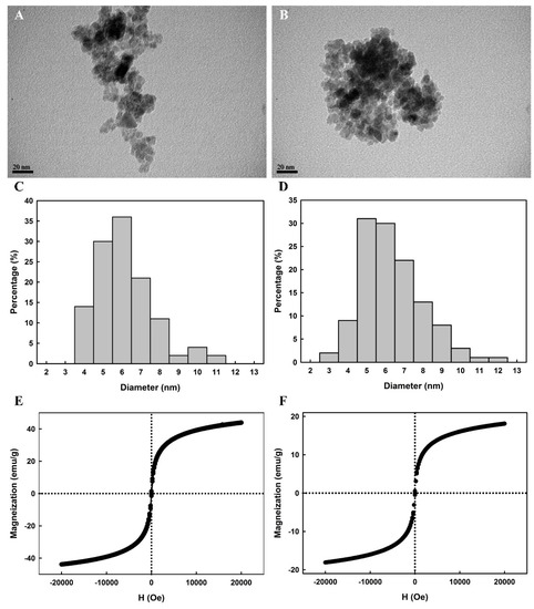 TEM micrographs (A,B), particle size distributions (C,D), and magnetization curves (E,F) of iron oxide (A,C,E) and His6-EcPepQ@NiNTASiMNP (B,D,F).