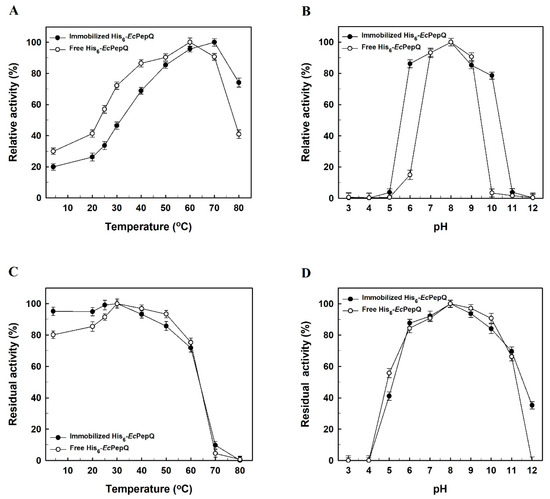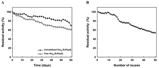 It is well known that enzymes in solution are unstable, and that their activities decline progressively during the course of operation. In this regard, thermal stability tests were carried out with free and immobilized enzymes in 25 mM Tris-HCl buffer (pH 8.0) at various temperatures, and the results were shown in Figure 5C. Our experimental data reveal that the affinity-driven immobilization does not significantly enhance the heat resistance of His6-EcPepQ. The stability of free and immobilized enzymes was also determined by incubating both samples at different pH conditions. As shown in Figure 5D, both forms of His6-EcPepQ displayed a similar stability profile with the highest residual activity at pH 8.0.