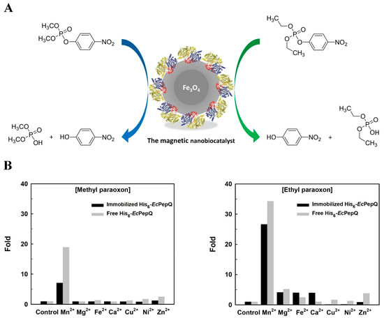 Schematic illustration of the enzymatic hydrolysis of methyl paraoxon and ethyl paraoxon by His6-EcPepQ@NiNTAMPNs (A), and effects of different divalent metal ions on their hydrolysis (B).