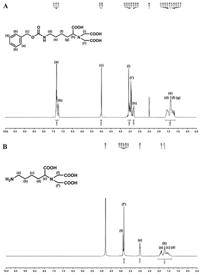 Analysis of the hydrogenation of N6-carboxybenzyloxy-N2,N2-bis(carboxymethyl)lysine. (A) 1H NMR spectrum of N6-carboxybenzyloxy-N2,N2-bis(carboxymethyl)lysine in DMSO-d6. 1H NMR signals of this compound were 7.25–7.40 (m, 5H), 7.21 (t, 1H, J = 5.5 Hz), 4.98 (s, 2H), 3.46 (m, 4H), 3.33 (t, 1H, J = 7.2 Hz), 2.85–3.05 (m, 2H), 1.15–1.65 (m, 6H) and 1.40–1.90 (m, 6H). (B) 1H NMR spectrum of the fully hydrogenated product, N2-bis(carboxymethyl)lysine, in DMSO-d6. 1H NMR signals of the desired product were 3.75–3.90 (m, 5H), 2.89 (t, 2H, J = 7.2 Hz), and 1.40–1.90 (m, 6H).