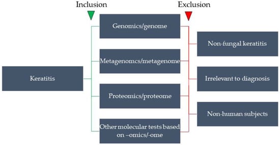 We searched the PubMed database for articles published in English on the omics approach to FK. The search strategy included the following keywords, “fungal keratitis”, “mycotic keratitis”, “keratomycosis”, “diagnosis”, “genome”, “genomics”, “polymerase chain reaction”, “oligonucleotide hybridization”, “next-generation sequencing”, “metagenome”, “metagenomics”, “transcriptome”, “transcriptomics”, “metatranscriptome”, “metatranscriptomics”, “mass spectrum”, “mass spectrometry”, “proteome”, “proteomics”, “metaproteome”, “metaproteomics”, “lipidome”, “lipidomics”, “glycome”, “glycomics”. The anterior 3 keywords were variously combined with the following keywords for a specific search. The articles were selected based on the following inclusion and exclusion criteria (Figure 1).
