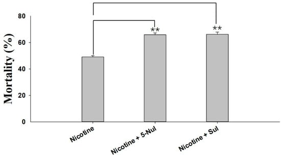 Synergistic effects of sulfinpyrazone (Sul) and 5-nitrouracil (5-Nul) on the toxicity of nicotine in M. persicae nicotianae. The final concentrations of nicotine, Sul, and 5-Nul in the artificial diet were 100 mg/L, 12.5 mg/L, and 12.5 mg/L, respectively. Mortality was recorded after 48 h of treatment (three replicates, 80 apterous adult aphids per replicate). Error bars indicate 95% confidence intervals (n = 3). ** Significant difference according to Student’s t-test (p < 0.01).