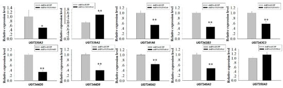 Relative expression of 10 UGT transcripts in M. persicae nicotianae. dsRNA-mediated 48 h after oral delivery of dsRNA. Suppression of UGT (UGT330A3, UGT339A2, UGT341A6, UGT342B3, UGT343C3, UGT344D5, UGT344D8, UGT348A3, UGT349A3, and UGT350A3) expression in M. persicae nicotianae fed an artificial diet with corresponding dsRNA (100 ng/μL) for 48 h. Error bars indicate 95% confidence intervals (n = 3). * Significant (p < 0.05) difference according to Student’s t-test. ** Significant (p < 0.01) difference according to Student’s t-test.