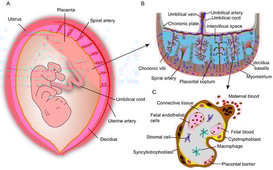 Schematic depiction of anatomical structures of the human placenta. (A) The placenta is an important organ for maternal–fetal physiologic exchange and attaches to the uterine wall. (B) Anatomical structure and composition of the human placenta. The umbilical vein transport oxygen- and nutrient-rich blood from the placenta to fetus, while two umbilical arteries carry waste products from the fetus to the placenta. The intervillous space is filled with maternal blood, which enters through remodeled spiral arteries. (C) The major cell types and the placental barrier, it consists of syncytiotrophoblasts, cytotrophoblasts, and fetal endothelial cells.