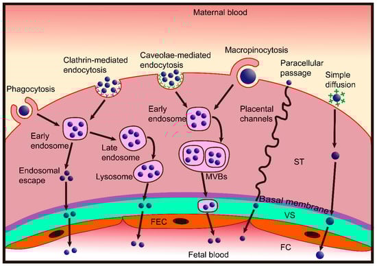 Pinocytosis is the primary method for uptake of small nanoparticles and is classified as either clathrin-mediated endocytosis (CME) or clathrin-independent endocytosis [51]. Two major clathrin-independent endocytosis pathways are caveolae-mediated endocytosis and macropinocytosis. The placental syncytiotrophoblast displays many clathrin-coated regions between the microvilli, and coated vesicles, which are important participants in macropinocytosis, are abundant in the cytoplasm [52]. Hence, nanoparticles could be taken up by trophoblasts via pinocytosis. Evidence of this possibility came from studies showing that positively charged polymeric nanoparticles and gold nanoparticles were internalized by syncytiotrophoblasts via CME and caveolae-mediated endocytosis [53,54,55]. More recently, BeWo b30 placental barrier cells preincubated with a variety of different placental-transporter inhibitors also demonstrated that cells primarily internalized pullulan acetate nanoparticles through caveolae-mediated endocytosis and pinocytosis pathways [56]. Furthermore, macropinocytosis has been proposed for the uptake of small liposomes and nanoparticles (<60 nm) into placental trophoblasts and capillary endothelium [52,57].