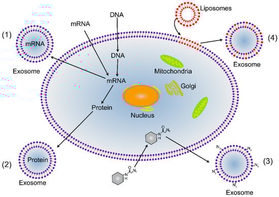 Exosomes are continuously shed from trophoblast cells into maternal circulation throughout gestation. Recently, it was demonstrated that chorionic villous trophoblasts (CVTs) are capable of modulating the activity of extravillous trophoblasts (EVTs) via exosomal miRNA [105,106,107]. Moreover, the number of exosomes produced during gestation is higher when pregnancy complications occur, such as preeclampsia and gestational diabetes mellitus (GDM), than in normal pregnancies [83]. Specifically, the number of placenta-derived exosomes is massive, and they can be taken up by trophoblasts. The level and content of placenta-specific exosomes may be a useful tool for the delivery of payloads to the placenta. Exosomes loaded with doxorubicin and siRNA have been reported as a feasible approach with great potential value for clinical applications [84,85]. Exosomes as drug delivery vehicles have multiple advantages. First, exosomes can be derived from a patient’s own cells, and thus, they may be less immunogenic and toxic than artificial nanoparticles [108]. Second, exosomes have lipid bilayers, which may directly fuse with target cell membranes, thereby increasing cellular internalization of loaded drugs [109]. Third, the naturally small size of exosomes allows them to avoid phagocytosis by the mononuclear phagocyte system and facilitates their uptake in target tissues [85]. In addition, exosomes have also been proposed to specifically recognize their target cells, a feature that would reduce off-target effects [110,111]. Hence, placenta-specific exosomes may deliver payloads to the placenta by directly targeting trophoblasts. If not, placenta-specific exosome surfaces can be modified with targeting peptides or antibodies by manipulating trophoblasts, either through genetic or metabolic engineering or by introducing exogenous material that is subsequently incorporated into secreted exosomes (Figure 3). For example, the targeting peptides RVG (rabies viral glycoprotein peptide) and iRGD were successfully inserted into exosomes from immature dendritic cells using a genetic method [86,87]. Overall, re-engineering placenta-specific exosomes is a very promising approach for the development of bio-inspired, targeted drug delivery systems to treat pregnancy complications.