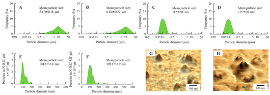Particle analysis of N-IMC and N-IMC/MT gels immediately after the bead mill treatment. (A) and (B); the particle size frequencies in transdermal formulations containing indomethacin (IMC) powder (P-IMC, A) and transdermal formulations containing IMC powder and l-menthol (P-IMC/MT, B) gels by SALD-7100. (C and D); the particle size frequencies of N-IMC (C) and N-IMC/MT (D) gels by SALD-7100. (E and F); the particle size frequencies of N-IMC (E) and N-IMC/MT (F) gels by NANOSIGHT LM10. (G and H); atomic force microscope (AFM) images of N-IMC (G) and N-IMC/MT (H) gels by SPM-9700. The particle size of IMC was decreased to approximately 50–200 nm, and no differences were observed in the particle characterizations between the N-IMC and N-IMC/MT gels.