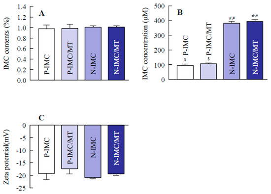 The stability and particle characterization of N-IMC and N-IMC/MT gels. (A); the dispersity in the base of IMC transdermal formulations. (B); the solubility of IMC in transdermal formulations. (C); the zeta potential of IMC in transdermal formulations. n = 6–8. * p < 0.05 vs. P-IMC gel for each category. # p < 0.05 vs. P-IMC/MT gel for each category. $ p < 0.05 vs. N-IMC gel for each category. Almost all IMC was in the solid state in the IMC transdermal formulations (ratio, solid form: solution form = 98.6: 1.4), and the drug homogeneity (dispersity, standard error) in the solid nanoparticles (SNPs)-based transdermal formulations was higher than in the microparticles-based transdermal formulations. The zeta potentials of the IMC transdermal formulations with or without l-menthol were similar, and the IMC contents in the microparticles-and SNPs-based transdermal formulations did not change for 1 month.