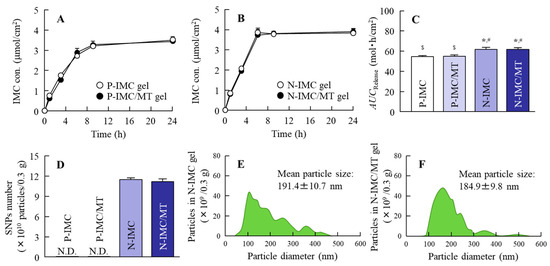 IMC release from the transdermal formulations through 20 µm pore membranes. (A); the drug release from the P-IMC and P-IMC/MT gels through the membranes. (B); the drug release from the N-IMC and N-IMC/MT gels through the membranes. (C); the area under the IMC concentration-time curve of drug release (AUCRelease) for the IMC transdermal formulations. (D); the number of IMC SNPs released from the transdermal formulations 24 h after application. (E) and (F); the size frequencies of IMC released from the N-IMC (E) and N-IMC/MT (F) gels 24 h after application. These samples were collected in the reservoir chamber. n = 7. * p < 0.05 vs. P-IMC gel for each category. # p < 0.05 vs. P-IMC/MT gel for each category. $ p < 0.05 vs. N-IMC gel for each category. The combination with l-menthol did not affect drug release from the IMC transdermal formulations, and the IMC released from the N-IMC and N-IMC/MT gels was in the SNPs state (mean particle size, N-IMC gel 191.4 nm, N-IMC/MT gel 184.9 nm).
