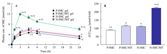 The percutaneous absorption of IMC transdermal formulations. (A) Transdermal penetration for the IMC transdermal formulations. (B) AUCPlasma values for the IMC transdermal formulations. n = 6–7. * p < 0.05 vs. P-IMC gel for each category. # p < 0.05 vs. P-IMC/MT gel for each category. $ p < 0.05 vs. N-IMC gel for each category. The difference between the N-IMC and N-IMC/MT gels was significantly higher than that of the corresponding microparticles-based transdermal formulations, and the AUCPlasma for the N-IMC/MT gel was 2-fold higher than for the N-IMC gel.