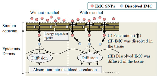 Next, the effect of l-menthol on the skin penetration of the SNPs-based transdermal formulations was demonstrated. The skin comprises outer (epidermis), middle (dermis), and inner (subcutaneous tissue) layers, and the epidermis is divided into the SC (non-viable epidermis, which is hydrophobic) and the viable epidermis (hydrophilic). The thickness of the dermis is approximately 0.5–3 mm, and contains nerve endings, sweat glands, lymph vessels, and blood vessels. The subcutaneous tissue in the innermost layer relates to physical protection, nutritional support and temperature regulation [30,31,32]. In terms of the skin penetration of drugs, it is known that it is difficult for hydrophilic drugs to penetrate through the SC, since the SC is hydrophobic. Although the SC acts as a barrier for hydrophilic drugs, small amounts of hydrophilic drugs can penetrate through the SC. However, the penetrating hydrophilic drugs show limited ability to permeate through the hydrophilic viable epidermis [30,31,32]. Therefore, TDDs require careful design to allow for the skin penetration of drugs. For TDDs containing SNPs, our previous studies using ketoprofen, tranilast, indomethacin, ibuprofen and raloxifene demonstrated that SNPs with particle sizes under 100 nm penetrated into the SC [15,16,17,18,19,33]. Furthermore, these SNPs permeate by energy-dependent endocytosis and the drugs that are dissolved in this process are delivered into the systemic circulation [15]. The particles in the N-IMC gel were approximately 50–200 nm in size, and skin penetration of IMC was observed by application of the N-IMC gel, and the skin penetration of N-IMC gel was higher in comparison with the P-IMC gel consisting of IMC microparticles (Figure 5A,B). On the other hand, the skin penetration was attenuated under low temperature (4 °C) conditions [22] at which the function of all energy-dependent uptake, including endocytosis, is inhibited in cells (Figure 5C,D). In addition, no IMC nanoparticles were detected in the reservoir chamber treated with N-IMC or N-IMC/MT gels. These results using the N-IMC gel support previous studies using ketoprofen, tranilast, indomethacin, ibuprofen and raloxifene [15,16,17,18,19,33]. On the other hand, the combination with l-menthol enhanced the IMC skin penetration rate (Jc and ka) of the N-IMC/MT gel (Table 1 and Table 2), and the AUCSkin of the N-IMC/MT gel was 2.5-fold higher than the N-IMC gel (Figure 5D). Moreover, the AUCPlasma of the N-IMC/MT gel was also higher than N-IMC, and the difference between the N-IMC and N-IMC/MT gels was significantly higher than that between the corresponding P-IMC-based transdermal formulations (Figure 5). Kaplun-Frischoff and Touitou [21] reported that l-menthol spreads the cell gap in SC, and enhances skin absorption via alterations in the barrier properties of the SC. In addition, the skin penetration of N-IMC/MT gel was higher than the N-IMC gel, although skin penetration was attenuated under the low temperature conditions (Figure 5C,D). Taken together, it was hypothesized that l-menthol decreases the barrier function of the SC, and this alteration allows easy penetration of the N-IMC gel to penetrate more easily through the SC. The penetrated IMC SNPs may be taken up into the cells (viable epidermis) by energy-dependent endocytosis, and may shift to the dermis and subcutaneous tissue layers. During this process, the N-IMC gel is dissolved, and delivered into the blood circulation, resulting in the increase in percutaneous absorption (Figure 7).