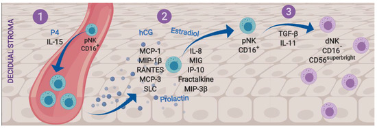 - Carlino, C.; Stabile, H.; Morrone, S.; Bulla, R.; Soriani, A.; Agostinis, C.; Bossi, F.; Mocci, C.; Sarazani, F.; Tedesco, F.; et al. Recruitment of circulating NK cells through decidual tissues: A possible mechanism controlling NK cell accumulation in the uterus during early pregnancy. Blood 2008, 111, 3108–3115. [Google Scholar] [CrossRef]
