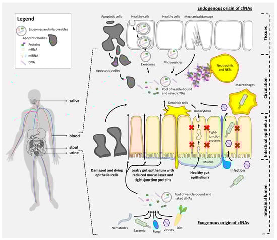Origin, organization, routes of transfer, and availability for convenient sampling of cell-free nucleic acids (cfNAs). CfNAs can be readily isolated from various body fluids, including blood, saliva, urine, and stool, in which they are either naked or carried by various types of vesicles. Depicted are the most common sources of cfNAs in the circulation, which are relevant for inflammatory bowel disease (IBD), including endogenous sources (such as apoptotic bodies, exosomes, microvesicles, neutrophil extracellular traps (NETs), necrosis) as well as exogenous sources (such as diet and the intestinal microflora, including bacteria, fungi, nematodes, and viruses). Endogenous cfNAs most commonly originate from regulated or unregulated cell death (necrosis, mechanical damage vs. apoptosis, NETosis), or are secreted during processes of cell–cell communications (exosomes, microvesicles). Those of exogenous origin may reach the circulation by several processes such as hijacking the physiological transport machineries, transcytosis (vesicular uptake on one side of the epithelial barrier and release on the opposite side), continuous immunological sampling of antigens by dendritic cells, but also as a result of inefficient epithelial barrier functions during pathological processes. Common sources such as developing a fetus or tumors are not depicted, although the detection of colitis-to-cancer transition may have specific relevance for IBD patients. Apoptotic bodies may include also cellular organelles; however, these are not depicted. Since the figure focuses on the cfNAs content of the blood, content having endogenous origin in the intestinal lumen is not depicted, even though stool analysis may have specific relevance for the monitoring of health status and therapeutic effectiveness in IBD patients. Note that this depiction did not differentiate between single-layered and double-layered vesicles, and also that all the graphical components are illustrative and are not representative of real dimensions.