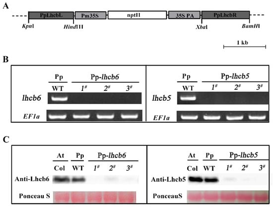 The identification of knock-out mutants. (A) The plasmid vector’s schematic maps of pTN182-PpLhcb5/6 used for knock-out a generation. (B) The expression of PpLhcb6 and PpLhcb5, in wild-type and knock-out mutants, was analyzed by RT-PCR. (C) Immunoblotting of Lhcb6 and Lhcb5 from Arabidopsis (Col) and Physcomitrella (wild-type (WT) and lines of knock-out mutants). The chlorophyll content of every lane was 15 μg. Proteins were stained with Ponceau S and Rubisco proteins were used as loading controls.