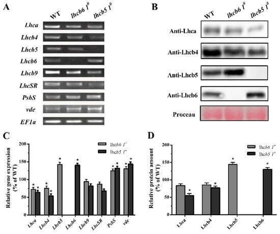 Analysis of Lhc genes or protein accumulation in wild-type and mutants. (A) The expression of Lhc-related genes was analyzed by RT-PCR. EF1a was used as reference gene. Lhc, Light-harvesting complexes. PsbS, PSII subunit S. vde, violaxanthin de-epoxidase. (B) Immunoblotting of the Lhca, Lhcb4, Lhcb5 and Lhcb6 in wild-type and mutants. Rubisco proteins were used as loading controls and were stained by Ponceau S. (C) Quantification of Lhc expression levels in WT and mutants. (D) Immunological quantification of Lhc proteins in thylakoid membranes. The data represent means ± SD of three biological replicates. Statistical significance compared with the wild-type p is indicated by asterisks (** p ≤ 0.01, * p ≤ 0.05, Student’s t-test).