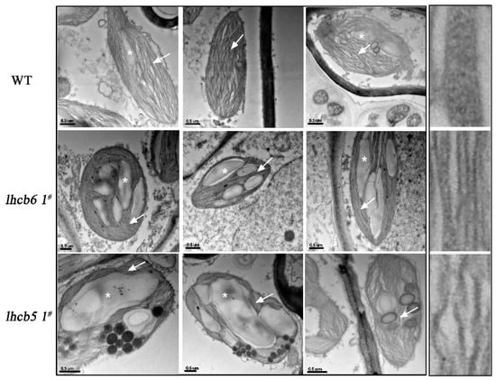 In higher plants, the minor antenna proteins Lhcb6 and Lhcb5 affect the interactions of PSII subunits and the electron transport rate in grana membranes, especially for limiting plastoquinone diffusion [22,23,26]. Here, the absence of either Lhcb5 or Lhcb6 influenced the ultrastructure of chloroplast and the accumulation of thylakoid proteins, and particularly, reduced the number of stacked grana and increased the amount of starch granules (Figure 3). The disordered arrangement of thylakoid lamella and increased starch granules suggested that Lhcb6 and Lhcb5 might maintain the chloroplast ultrastructure in vivo.