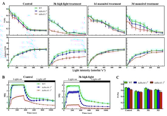 Detailed characterization of chlorophyll fluorescence in wild-type and mutants. (A) Light-response curves of PSII quantum yield and ETR in wild-type and mutants. (B) Time courses for induction and relaxation of non-photochemical quenching (NPQ) before, and after, 3 h of high light treatment. (C) The maximal photochemical efficiency of PSII. HL represents high light treatment for 3 h. M1 or M3 represent plants under 500 mM mannitol for 1 day or 3 days, respectively. The data represent the means ± SD of three biological replicates. Statistical significance compared with the wild-type p is indicated by asterisks (* p ≤ 0.05, Student’s t-test).