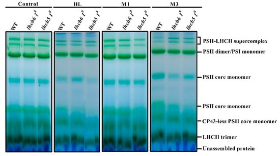 After a short-term high-light treatment, the proteins of the PSII reaction center were damaged. Then, a rapid repair and reassembly process occurred to enable photosynthetic electron transportation [24]. The defected photosynthesis in mutants was possibly caused by a reduced level of protein complexes in the electron transport chain. To further investigate the effects of Lhcb6 and Lhcb5 on the formation of thylakoid membrane protein complexes under abiotic stress, thylakoid membranes (with equal amounts of chlorophyll) in different plants were solubilized in 1% n-dodecyl-β-D-maltoside (DM) and the chlorophyll–protein complexes were separated by BN-PAGE. Six protein complexes, PSII-LHCII super-complex, PSII dimer/PSI monomer, PSII core monomer, CP43-less PSII core monomer, LHCII trimer, and unassembled protein were resolved (Figure 5). Under high-light stress, the PSII core monomer of the lhcb5 1# mutant was reduced, suggesting Lhcb5 might associate with the formation and stability of the PSII complex. Under osmotic stress, the amount of monomer and free pigment of mutants did not show significant differences compared with wild-type plants. These results suggest that light was a critical abiotic factor that limits the photosynthesis efficiency of PSII in Physcomitrella.