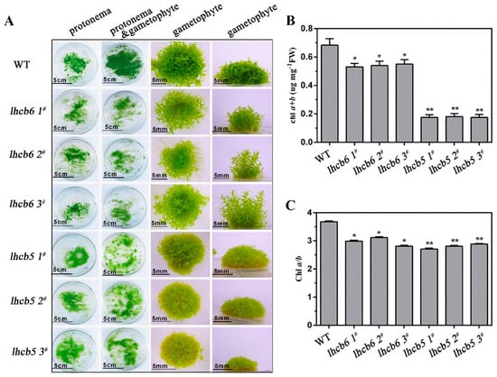 The phenotype and chlorophyll content of wild-type and mutant plants. (A) The protonema and gametophyte phenotypes of wild-type and mutants. The protonema tissues of wild-type and mutants were grown for one week on ammonium tartrate-free BCD medium. The protonema and gametophyte tissues were grown in this medium for four weeks. The gametophyte tissues were grown in the same medium for six-weeks. The chlorophyll a+b content (B) and chlorophyll a/b ratio (C) of leafy gametophyte tissues. FW, Fresh weight. The data represent the means ± SD of three biological replicates. Statistical significance compared with the wild-type is indicated by asterisks (** p ≤ 0.01, * p ≤ 0.05, Student’s t-test).