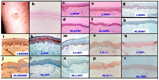 Clinical appearance of SLs and the immunochemistry of SLs and non-lesional skin with antibodies to various melanogenic cytokines and receptors [,]. L: Lesion, NL: Non-lesion. (a) Clinical appearance of SLs on the forearm; (b) Hemoxylin & Eosin staining; (c,d) Immunohistochemistry with anti-bFGF; (e,f) Immunohistochemistry with anti-GROα; (g,h) Immunohistochemistry with anti-EDN1; (i,j) Immunohistochemistry with anti-EDNBR; (k,l) Immunohistochemistry with anti-SCF; (m,n) Immunohistochemistry with anti-c-KIT; (o,p) Immunohistochemistry with anti-IL-1α; (q,r) Immunohistochemistry with anti-TNF.