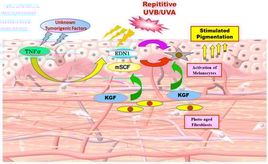 On the other hand, other groups have hypothesized that keratinocyte growth factor (KGF)/KGF receptor (KGFR) play an important role in the initiation of SL formation and in increased pigmentation only in the epidermis of earlier SLs stages []. In the lesional epidermis [] and/or dermis [] of SLs, KGF expression is upregulated only at the immune-staining level although further studies on its gene and protein expression are required for any final conclusions on it as an intrinsic cytokine causing SLs. While IL-1α is known to cause keratinocytes to stimulate the production of KGF, it remains unclear as to how KGF expression is upregulated in the lesional epidermis where IL-1α expression is rather downregulated []. Of course, it should be determined as to whether TNFα (that is upregulated in the lesional epidermis) has an ability to stimulate KGF production. Since KGF expression in the skin is primarily confined to dermal fibroblasts, it is plausible that the increased expression of KGF by dermal fibroblasts in the lesional dermis of SLs [] is associated with both the increased proliferation of keratinocytes and the stimulated melanogenesis. Thus, it is likely that dermal fibroblasts are persistently activated by UV exposure to release KGF, which acts directly or indirectly thorough keratinocytes to modulate the expression of SCF, contributing to the hyperpigmentation of SL [].