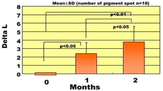 Using an M. chamomilla extract-containing stick type wax, we examined the clinical effects on pigmentation in SLs. In this clinical study, each pigmented spot was examined for color changes and the degrees of clinical improvement and validity were evaluated. A clinical evaluation performed at the Tokyo Women’s Medical University revealed that treatment for two months with the M. chamomilla extract resulted in 48% of subjects showing a marked improvement and 40% with slight improvement []. In the changes of pigmentation level measured by ΔL values, all patients with SLs had distinct increases over two in their ΔL value, a visibly recognizable level, after treatment for 2~3 months. There was a significant decrease in the pigmentation level as measured by ΔL values between 0, 1, and 2 months after treatment (Figure 7). Overall, the clinical evaluation for three months revealed that treatment with the M. chamomilla extract resulted in 42% of subjects showing a marked improvement, 12% with a moderate improvement, and 25% with slight improvement. Another clinical trial performed in two related dermatological hospitals in Tokyo demonstrated that treatment with the M. chamomilla extract gradually reduced the pigmentation and after six months, resulted in approximately 70% of subjects showing more than slight improvement including 10% with disappearance and 15% with marked improvement. There were two cases where the SLs completely disappeared after approximately six months of treatment, with ΔL values increasing up to 8.4 and 6.9 after six months of treatment (Figure 8) [].