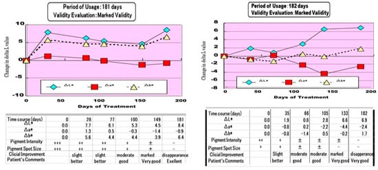 The relationship between the L values and melanin indices for all measurements during this clinical study revealed a significant correlation between them both. This result indicated that a 2.0 ΔL value was approximately equivalent to a 20 Δ melanin index with a 10-fold higher sensitivity in the melanin index than the L value. A comparison between the L values and melanin indices for each measurement at weeks 0 and 24 on SLs revealed significant correlations. These comparisons between the L values and melanin indices indicated that there was a marked distribution shift toward a lighter color such as a greater L value and a smaller melanin index in the test lotion-treated SLs whereas there was no such distinct distribution shift in the placebo lotion-treated SLs [].