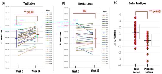 Changes in the L values of SLs after treatment for 24 weeks []. (a) Test lotion, N = 27, (b) Placebo lotion, N = 27, (c): △L values between weeks 0 and 24. N = 27, *** p < 0.001.