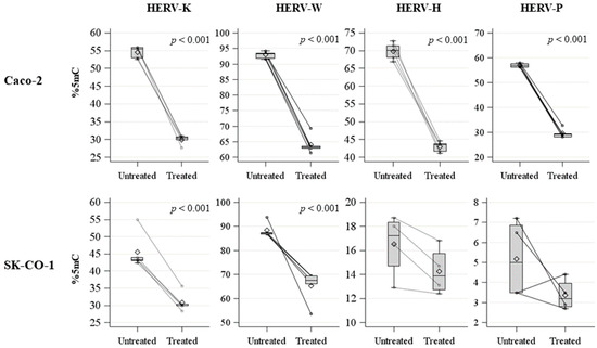 Spaghetti plot and box plot of HERV-H, HERV-K, HERV-W, and HERV-P LTRs methylation levels (%5mC) in untreated and treated Caco-2 and SK-CO-1 cells.