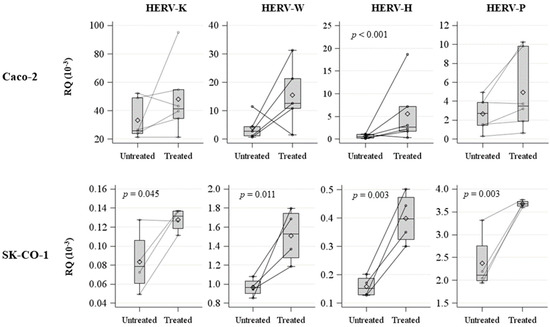 Spaghetti plot and box plot of HERV-H, HERV-K, HERV-W, and HERV-P expression levels (RQ 10−3) in untreated and decitabine-treated Caco-2 and SK-CO1 cells.