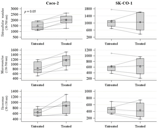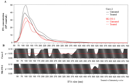 No significant differences were detected between untreated and decitabine-treated SK-CO-1 cells (Figure 3). We further analyzed the effect of decitabine treatment in terms of the distribution of mean vesicle concentrations for each EV size. In the upper part of each panel of Figure 4A, we reported the mean concentration for all EV sizes (i.e., from 30 to 700 nm). The comparisons among the EV sizes are shown in Figure 4B, where the two p-values obtained, comparing decitabine-treated versus untreated (Poisson linear regression models for repeated measures at each size), respectively, for the Caco-2 and SK-CO-1 cells, were reported. EVs derived from Caco-2 cells were generally increased after decitabine treatment; on the contrary, EVs from the SK-CO-1 cells were reduced.