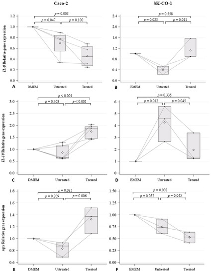4.7. RNA Extraction form Caco-2 and SK-CO-1 Cells, Reverse Transcription-PCR, and Real-Time Quantitative-PCR Assays (RT-qPCR)