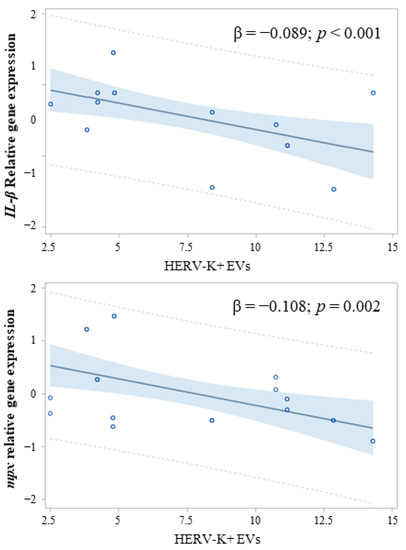 However, when we investigated the association between the concentration of total HERV-positive EVs versus HERV-K or HERV-W positive EVs and IL1-β or mpx, we found that the concentration of HERV-K positive EVs was inversely associated with the immune response, as measured by IL1-β gene expression (HERV-K: β = −0.110; p = 0.013) and mpx (HERV-K: β = −0.110; p = 0.013) (Figure 6).