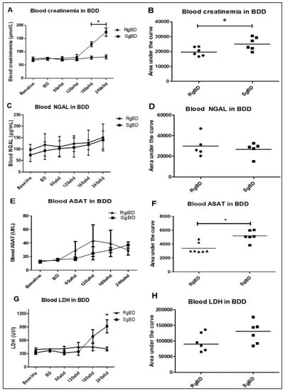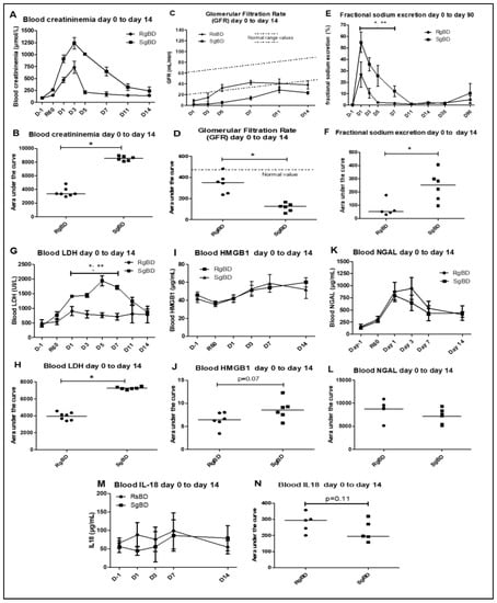 Blood NGAL, HMGB1 and IL18 proteins were assessed in porcine plasma using ELISA kit (respectively, Eurobio, Euromedex and Invitrogen France) according to the manufacturer’s instructions. Blood creatinine, sodium, lactate dehydrogenase (LDH) and aspartate aminotransferase (ASAT) were measured with a modular bioanalyzer (Roche-Diagnostics, France). Diuresis was evaluated by urine production after transplantation. Glomerular filtration rate (GFR) was calculated as: ((Diuresis mL/h)*urine creatinine)/blood creatinine = GFR L/h, and converted in GFR mL/min.