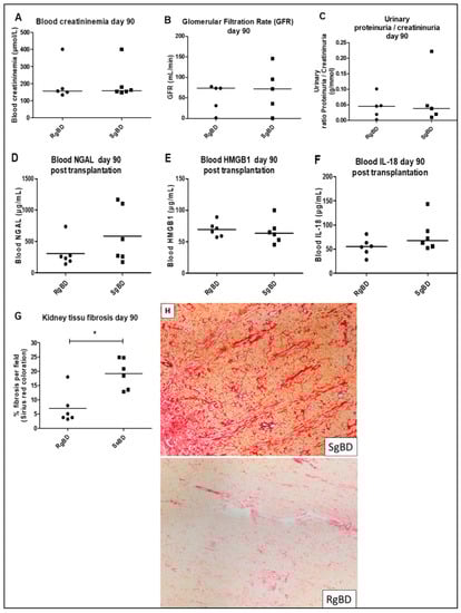 Biopsy samples from corticomedullary kidney collected at day 90 after transplantation were fixed with 4% formalin and paraffin-embedded. Histological interstitial fibrosis evaluated by red Sirius staining (collagen fibers I and III staining) was quantified with ImageJ software. Renal tubulitis and leukocyte infiltration were scored on histological HES staining.