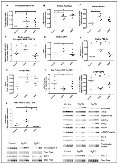 Western Blotting was carried out using specific antibodies; Bcl-2 (D17C4, Cell Signaling, France), Bax (ab115193, Abcam, France), aconitase 2 (ab110321, Abcam, France), nitrotyrosine (05-233, Millipore, France), 4HNE (ab5605, Millipore, France), sirtuine-3 (D22A3, Cell signaling, France), sirtuine-1 (SC-9475, Cell signaling, France), phosphorylated sirtuine-1 (Sc-2314, Cell signaling, France), peroxisome proliferator-activated receptor gamma coactivator 1-alpha (PGC1a, ab54481, Abcam, France), nuclear factor (erythroid-derived 2)-like 2 (NRF2, ab31163, Abcam, France), mammalian target of rapamycin (mTOR, 2983S, Cell signaling, France), phospho mTOR (5536P, Cell signaling, France), eNOS total (610296, BD Transduction, Le Pont de Claix, France) and eNOS phophorylated Ser1177 (C9C3; Cell-Signaling, Saint Quentin-Yvelines, France). Protein quantification level was expressed as ratio of total proteins loaded on precast gels with stain-free technology (BioRad, France). All blots were obtained by imaging with chemidoc and quantificated with ImageLab software (BioRad).