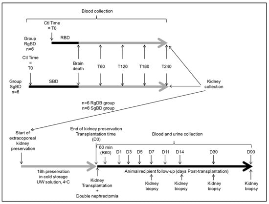 Figure 6). Blood collections were performed at day −1 (1 day before transplantation), 60 min after kidney reperfusion and at days 1 (D1), D3, D5, D7, D11, D14 and D90 after kidney transplantation. Follow-up was performed for 90 days, animals were anesthetized at D90 post-transplantation and the transplanted kidneys were collected for histological analysis.