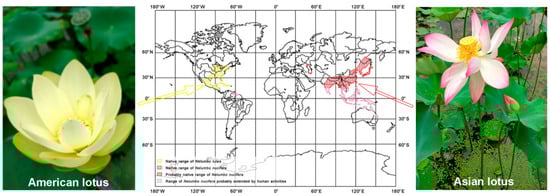 Lotus is a perennial aquatic plant. It belongs to the small family of Nelumbonaceae, comprising of only one genus Nelumbo with two species: Nelumbo nucifera Gaertn. and Nelumbo lutea Pear., which are popularly named as Asian lotus and American lotus, respectively [1]. Generally, lotus refers to Asian lotus and mainly distributes in Asia and the north of Oceania, while the American lotus primarily occurs in the eastern and southern parts of North America, as well as the north of South America [1,2,3,4] (Figure 1). Being separated by the Pacific Ocean, these two species differ in their external morphologies, such as petal color and shape, leaf shape and plant size [5] (Figure 1). In spite of this, both of them have the same chromosome number (2n = 16), and show a similar life style, with about five months of life span for each generation. Crossing between these two species could generate an F1 population, which is totally infertile. Although there are only two species of lotus in taxonomy, very abundant germplasms exist all over the world, which display variable genetic backgrounds and phenotypes, especially in Asia. In addition, the lotus is a basal eudicot, which makes it a very important species in plant phylogenetic and evolution studies.