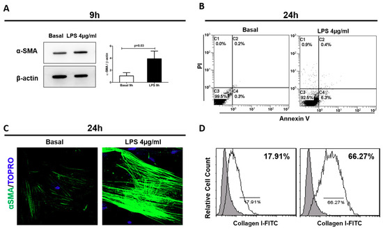 To test whether LPS was directly involved in the trans-differentiation of pericytes in myofibroblast, we cultured human pericytes in presence of LPS. A significant increase of α-SMA protein expression was detected after 9 h from LPS stimulation compared to basal condition (LPS:3.9 ± 1.27 vs. basal:1.08 ± 0.5, p = 0.03) (Figure 2A).