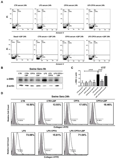 In order to understand the molecular mechanism involved in the CPFA anti-fibrotic function on human pericyte, we reconstituted the swine group sera with LBP. Both in CTR and CPFA sera, the addition of exogenous LBP did not influence α-SMA and Collagen I expression. Remarkably, the addition of exogenous LBP in sera of LPS CPFA pigs completely reverted the CPFA protective effect. We detected that after LBP sera reconstitution, LPS CPFA group sera re-acquired the capacity to induce PMT in vitro, as shown by the increase of α-SMA and Collagen I protein expression (Figure 3B,D).