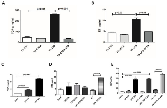 CPFA treatment modulated serum levels of TGF-β and ET-1, and LPS-stimulated pericytes secreted TGF-β and LBP. (A,B) Serum levels of TGF-β and ET-1 significantly increased after 9 h of LPS infusion compared to healthy pigs. Interestingly, CPFA-treated pigs presented a dramatic reduction in serum TGF-β and ET-1 levels. Data are expressed as median ± IQR of five independent pigs for each group. Statistically significant differences were assessed by the Mann–Whitney test. (C–E) cultured pericytes were stimulated with LPS and/or TGF-β, and their supernatants were analyzed by ELISA. Human endothelial cells (EC) and human liver hepatocellular cells (HepG2) were used as control positive for ET-1 and LBP synthesis, respectively.(C) LPS augmented TGF-β production in pericytes, particularly at 24 h. (D) LPS and/or TGF-β stimulation did not increase ET-1 production compared with EC treated with LPS for 24 h (positive control). (E) After 24 h from LPS stimulation, pericytes significantly increased LBP synthesis. Stimulation of pericytes with TGF-β alone did not influence LBP production. HepG2 stimulated with LPS for 24 h were used as positive control. Data were shown as mean ± standard deviation (SD) and compared with the Student t test.