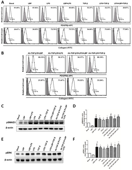 LBP-LPS axis induced PMT upon blocking TGF-βR. (A) Cultured pericytes were treated with LBP and/or LPS or TGF- β and with LBP, LPS, and TGF-β mixture for 24 h. LBP alone did not induce phenotypical changes in pericytes. Pericytes treated with LBP and LPS in combination or with LBP, LPS, and TGF-β mixture additively increased Collagen I expression and decreased PDGFRβ marker. (B) Pericytes were pretreated with anti-TGF-Βr-specific neutralizing antibody for 1 h followed by LPS and/or LBP stimulation for 24 h. FACS analysis showed that pericytes acquired phenotypic change also upon TGF-βR-blocking. Results are representative of three independent experiments. (C–F) Pericytes were pretreated with anti-TGF-βR specific neutralizing antibody for 1 h followed by LPS and/or LBP for short stimulation time (30 min). Pretreatment of pericytes with anti-TGF-βR antibody did not reduce LPS and LPS/LBP-induced phosphorylation of both SMAD3 (C,D) and ERK1/2 (E,F) at 30 min. Results are representative of three independent experiments. Data are shown as mean ± standard deviation (SD) and compared with the Student t test (D,F: * p < 0.05, ** p ≤ 0.005, versus basal level; $ p < 0.05 versus LBP).