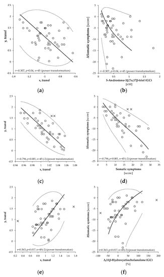 Pearson’s correlation between transformed values of absolute differences (after intervention-basal) of somatic symptoms score (y, transf; ΔSomatic symptoms) and transformed values of (a) 5-androstene-3β,7α,17β-triol (x, transf, 5-Androstene-3β,7α,17β-triol), (c) basal somatic symptoms (x, transf, somatic symptoms), and (e) of relative differences Δr ((value after intervention – basal value)/basal value) for 11β-hydroxyetiocholanolone (x, transf, Δr11β-hydroxyetiocholanolone). Power transformations were used to attain Gaussian distribution and to stabilize the variance in each variable. The straight full line, dashed curve, and circles in panels (a,c,e) represent the principal axis, 95% confidence interval, and experimental points, respectively in transformed data. The corresponding curves and circles in (b,d,f) depict the same after re-transformation to the original scales. The symbols r, p, and n represent the Pearson’s correlation coefficient, its statistical significance and number of measurements, respectively. The number in parenthesis signifies the number outlying points outside of the 95% confidence ellipsoid that were excluded from the correlation analysis. These points are marked as crosses.