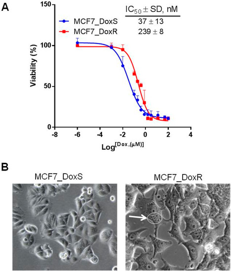 Figure 1. The development of doxorubicin resistance MCF7 cells (MCF7_DoxR). (A) Cell viability was measured using MTT assay to determine the IC50 (nM) of doxorubicin in MCF7_DoxR and MCF7_DoxScells after treatment with different concentrations of doxorubicin for 72 h. (B) The morphological appearance of MCF7 cells (20×) treated with doxorubicin (100 nM); the MCF7_DoxR contained multi-nucleated cytoplasm with large vesicles (white arrow/circle).