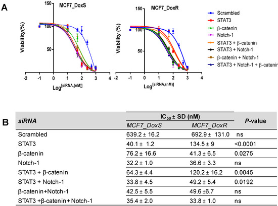 Figure 6. Dose–response curves and the IC50 values after siRNA treatment. The cell lines were treated with different concentrations of single and combinations of siRNAfor 72 h to assess the anti-proliferative effect on MCF7_DoxS and MCF7_DoxR cells. (A) The dose–response curves and (B) the IC50 values of single and combinations of siRNA in MCF7_DoxSand MCF7_DoxR cells. Scrambled siRNA was used as a negative control for comparison. All IC50 values represent the average of three independent experiments ± SD with four replicates per siRNA concentration for each experiment. Statistical significance: Student’s t-test, p < 0.05 indicates a significant difference, ns: not significant.