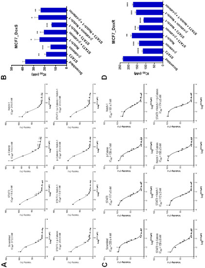 Figure 7. IC50 values after siRNA and doxorubicin treatment. Both MCF7_DoxS and MCF7_DoxR cells were treated with a fixed concentration of siRNA (50 nM) and different concentrations of doxorubicin for 72 h to assess the effect of siRNA and doxorubicin combinations on cell viability using the MTT assay. (A) The dose–response curves and (B) the IC50 values of doxorubicin combined with single and combinations of siRNA in MCF7_DoxS. (C) The dose–response curves and (D) the IC50 values of doxorubicin combined with single and combinations of siRNA in MCF7_DoxR. Scrambled siRNA was used as the negative control for comparison. All IC50 values represent the average of three independent experiments with four replicates per siRNA concentration for each experiment. Statistical significance: Student’s t test, * indicates p < 0.05, ** indicates p < 0.01, *** indicates p < 0.001, **** indicates p < 0.0001.