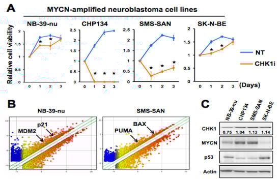 Checkpoint kinase 1 (CHK1) inhibition activates downstream targets of p53. (A) Cell viability assay of four MYCN-amplified neuroblastoma (NB) cell lines after exposure to dimethyl sulfoxide (DMSO) (NT) 1 μM CHK1 inhibitor (CHK1i) (PF-477736) for the indicated times. Data are presented as the mean ± SD of three independent experiments. * p < 0.05. (B) Microarray analysis of CHK1i-sensitive SMS-SAN cell line and the relatively insensitive NB-39-nu cell line at 36 h after treatment with 1 μM CHK1i or DMSO. (C) Immunoblot analysis of basal levels of CHK1, MYCN, and p53 in NB cells. β-actin was used as a loading control. Representative numbers were normalized to the intensity of the indicated bands.