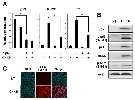 CHK1 inhibition activates the ataxia telangiectasia mutated serine/threonine kinase (ATM)-p53-p21 axis of the DNA damage response (DDR) pathway. (A) Quantitative RT-PCR analysis of p53, MDM2, and p21 mRNA levels in NB-39-nu cells transfected with 10 nM p53-specific or control siRNA for 24 h and then treated with 1 μM CHK1i (PF-47736) or DMSO for 24 h. Data are presented as the mean ± SD of triplicates and are normalized to ACTB levels. * p < 0.05. (B) Immunoblot analysis of the indicated proteins in NB-39-nu cells treated for 24 h with 1 μM CHK1i or DMSO (NT). β-actin was used as a loading control. (C) Indirect immunofluorescence of NB-39-nu cells treated for 24 h with 1 μM PF-477736 or DMSO. Cells were stained with polyclonal anti-p-p53-Ser15 (red) and 4′,6-diamidino-2-phenylindole (DAPI, nuclear DNA, blue).